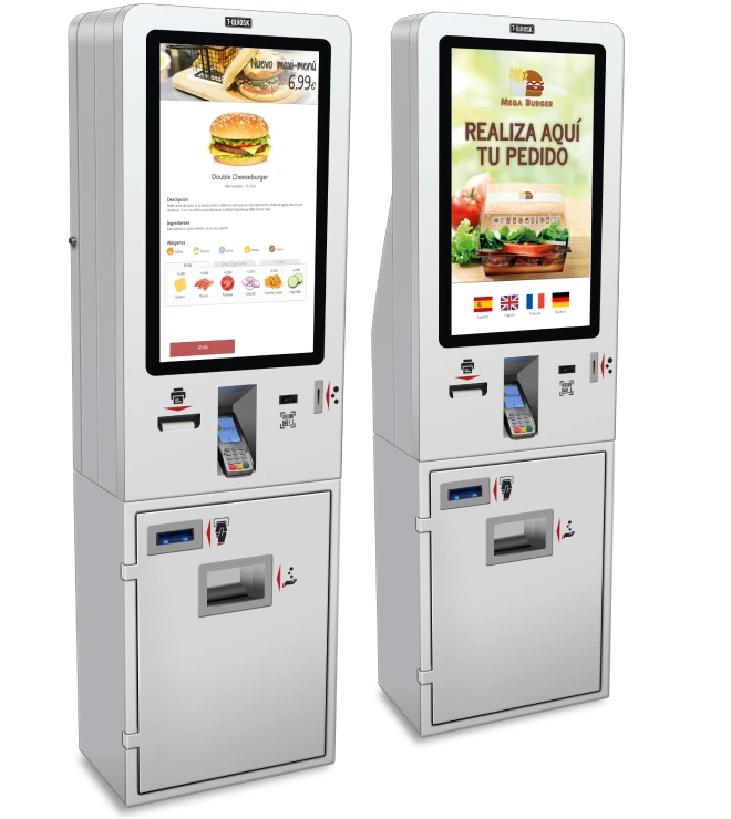 Procés pràctic i àgil per a realitzar demanats Els nostres quioscos de pagament amb targeta i efectiu estan dissenyats per a oferir als clients un procés pràctic i àgil per a realitzar comandes. En interactuar directament amb la seva comanda, es redueix el marge d'error i es millora el flux de comandes. A més, podran realitzar el pagament des del mateix quiosc, ja sigui amb targeta o en efectiu, evitant errors de canvi i desquadraments de caixes.